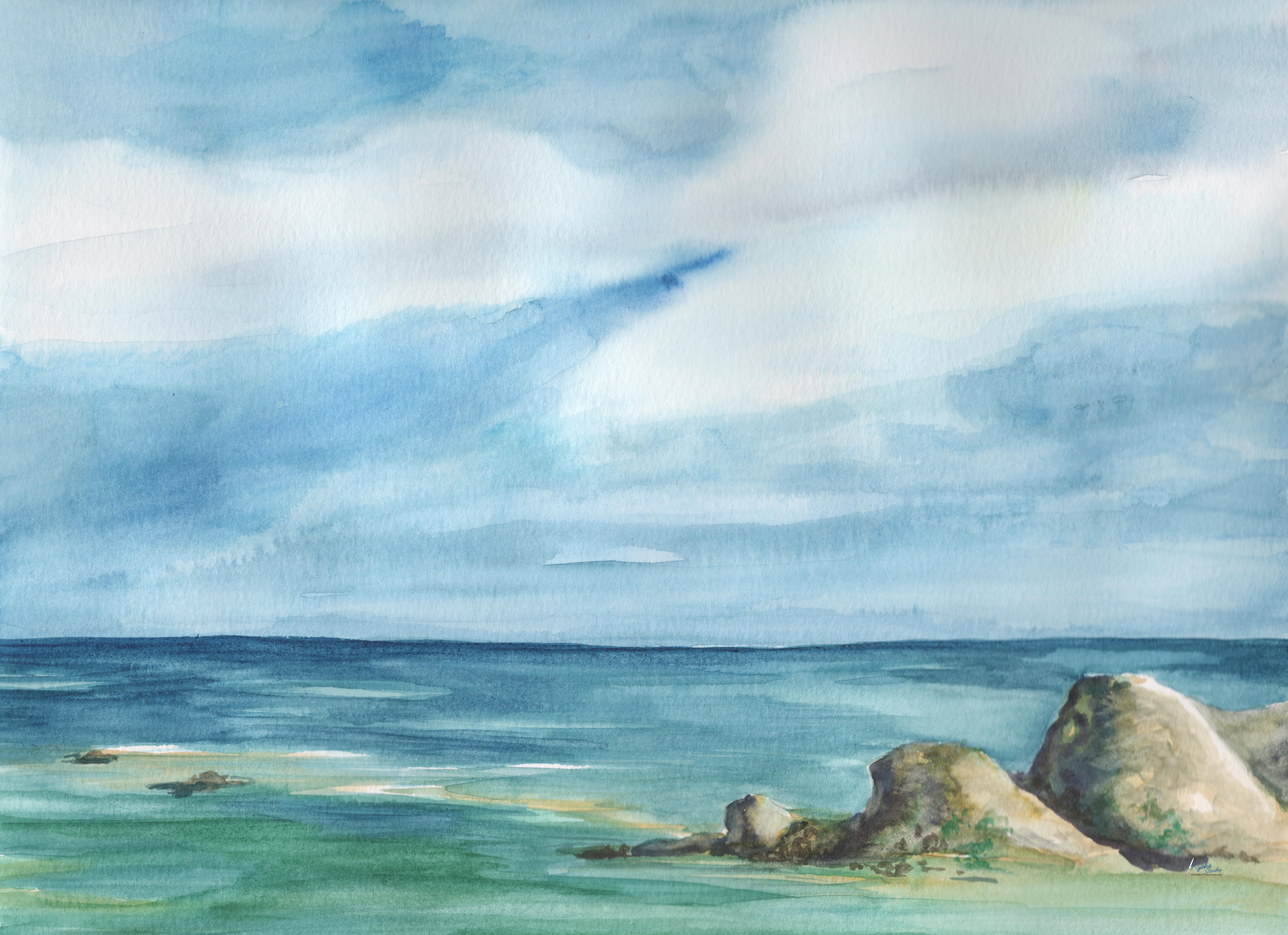 Watercolor paper, watercolor paint, 9 x 12 inches.
