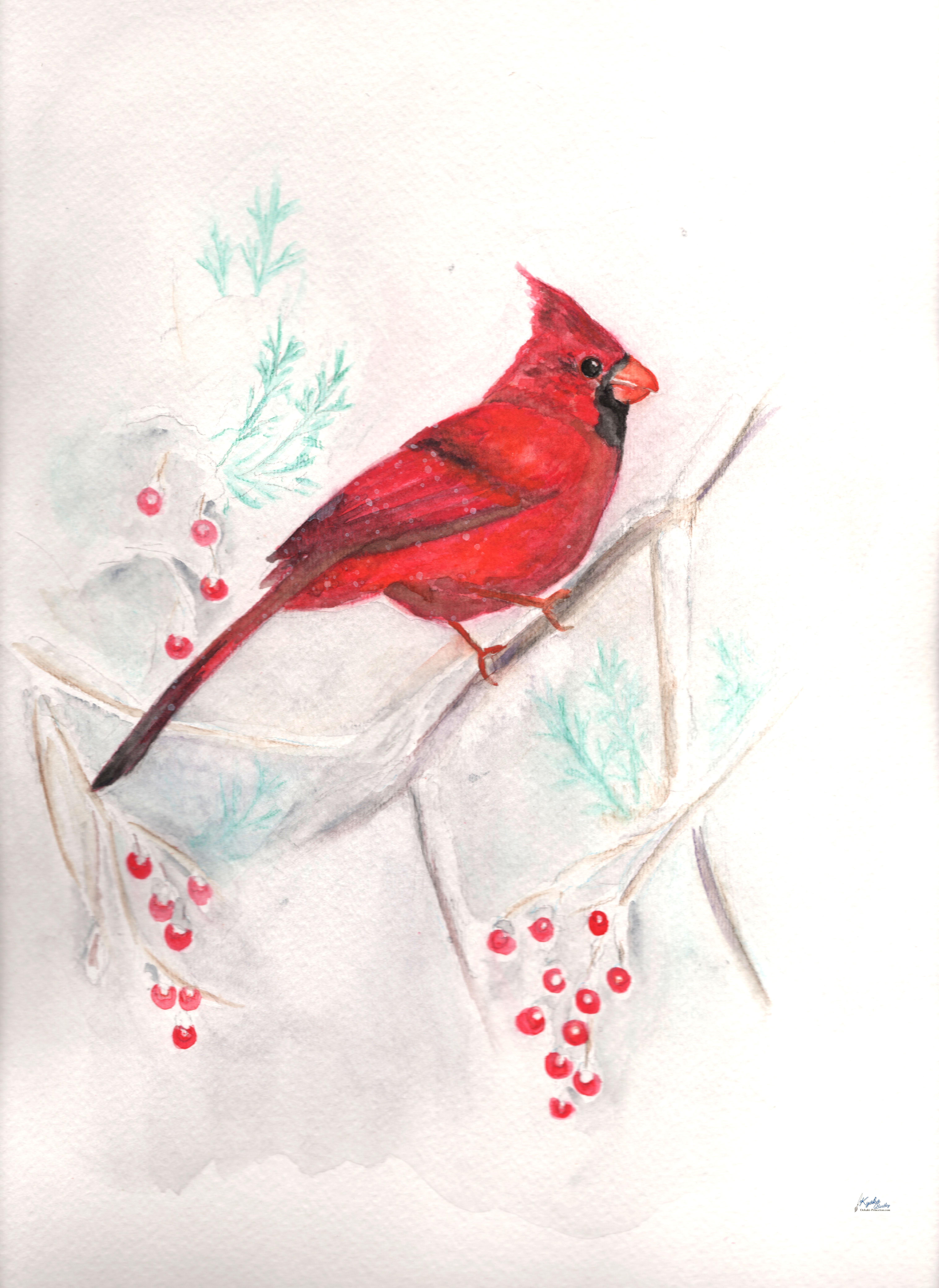 This piece is a watercolor of a cardinal in snow.